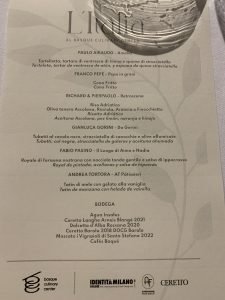 Los ocho chefs de reconocido prestigio fueron Andrea Tortona (AT Patissier), Antonia Klugmann (L’Argine a Vencò), Fabio Pisani (Il Luogo di Aimo e Nadia), Franco Pepe (Pepe in Grani), Gianluca Gorini (Da Gorini Ristorante), Paulo Airaudo (Amelia), y Richard Abou Zaki y Pierpaolo Ferracuti (Retroscena), que ofrecieron la siguiente cena: